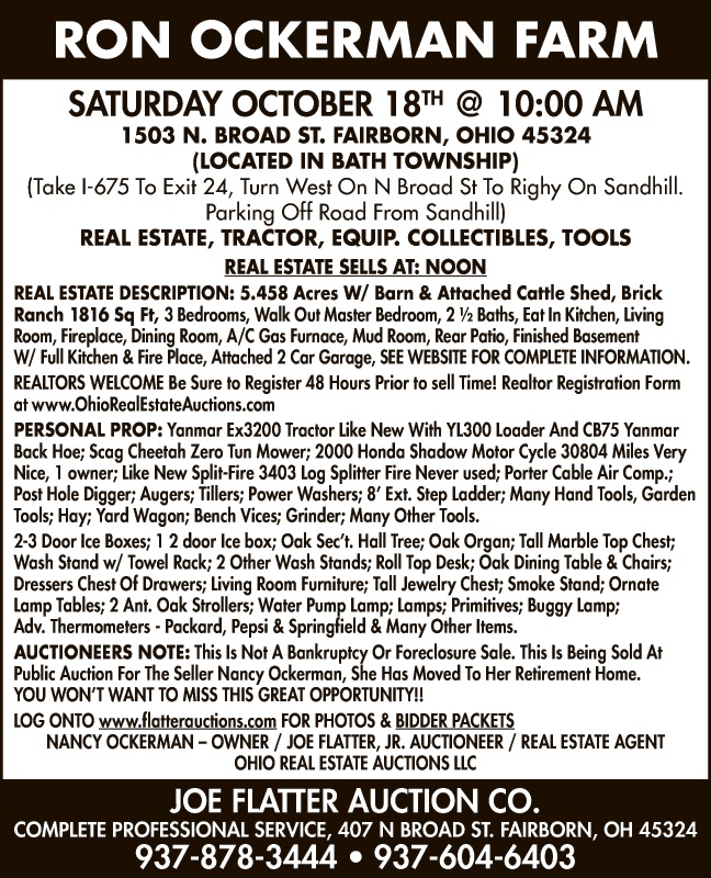 MARTHA RUFFNER COUNTRY AUCTION SAT., OCT. 18TH @ 10 :00 AM 4034 MAUE RD. MIAMISBURG, OH 45342 Take Exit 44 off I-75, g