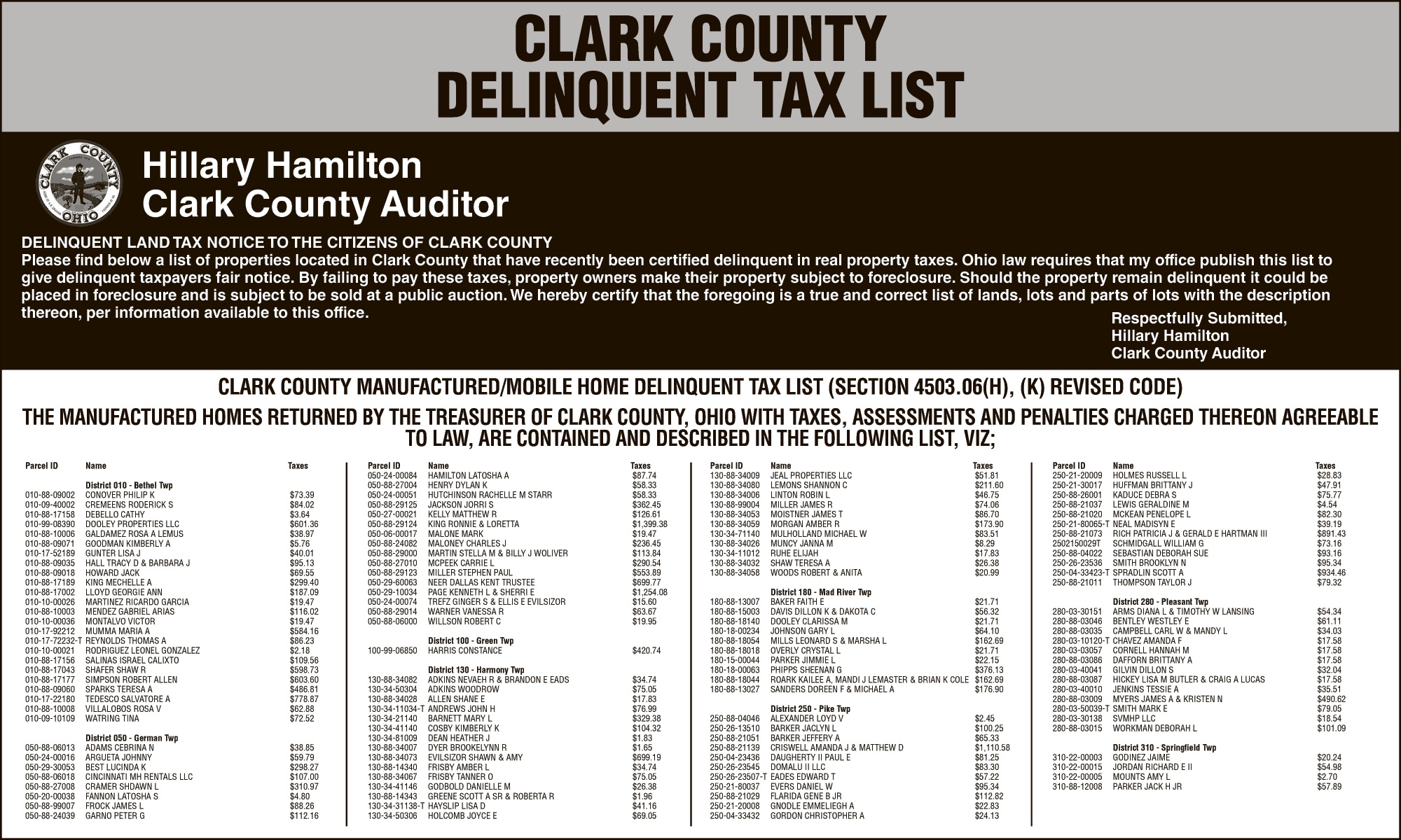 German Township (excluding the Village of Tremont City) Renewal Notice is hereby given that in pursuance of a Resolution of the
