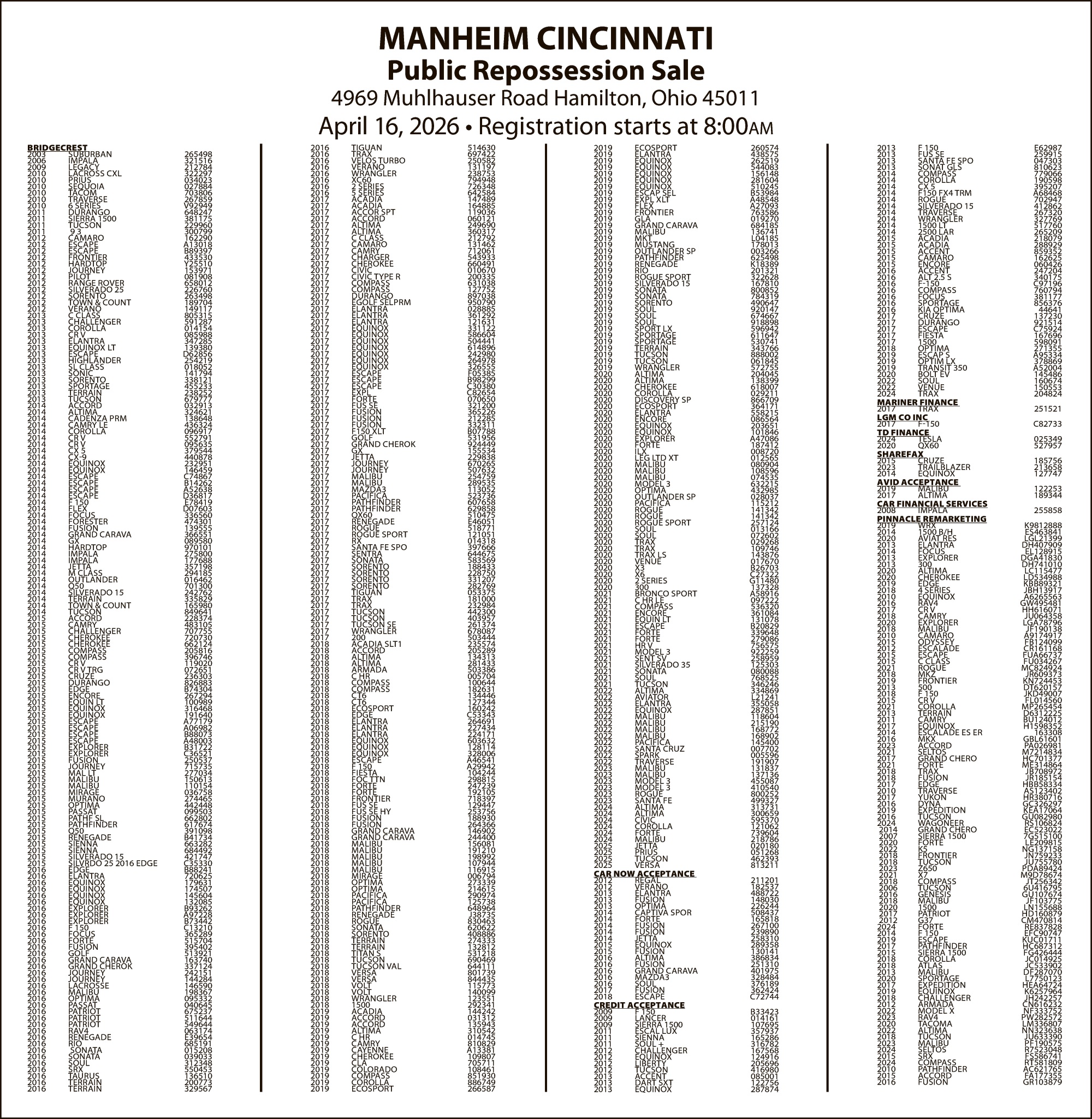 Legal Notice - MANHEIM APRIL 16 SALE