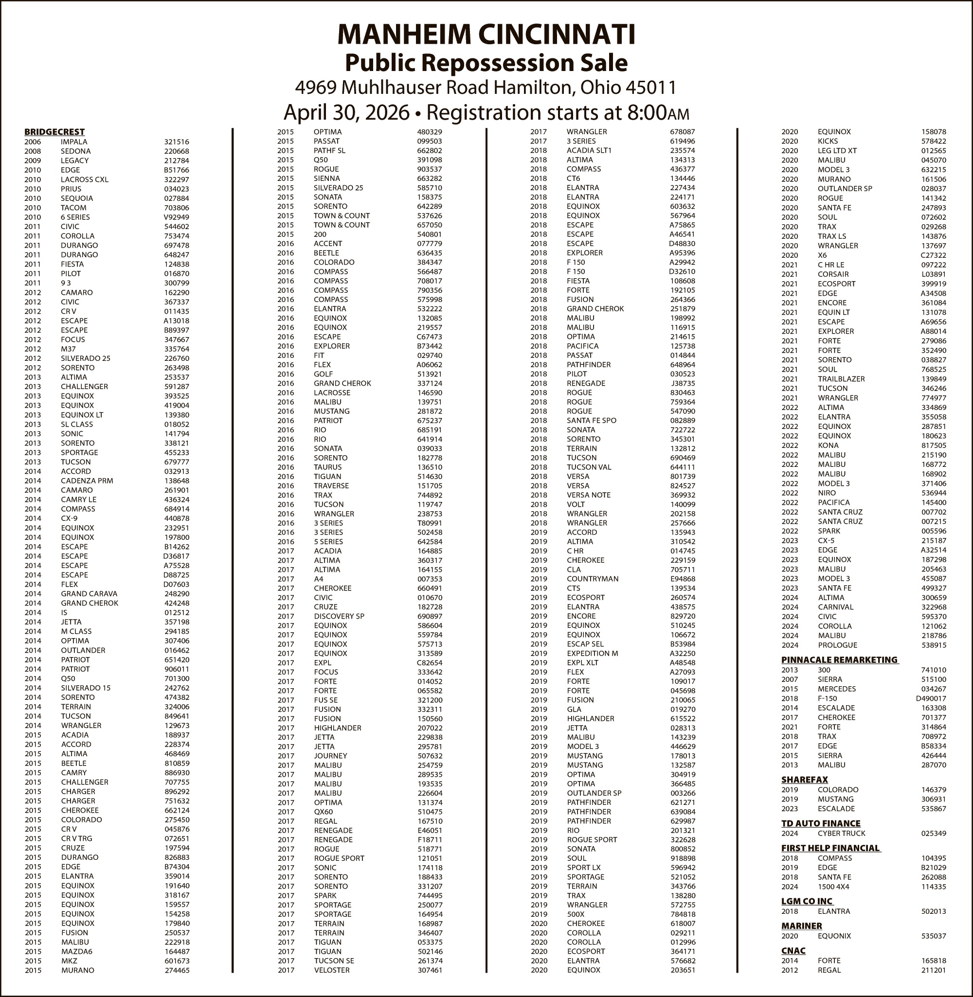 Legal Notice - MANHEIM APRIL 30 SALE