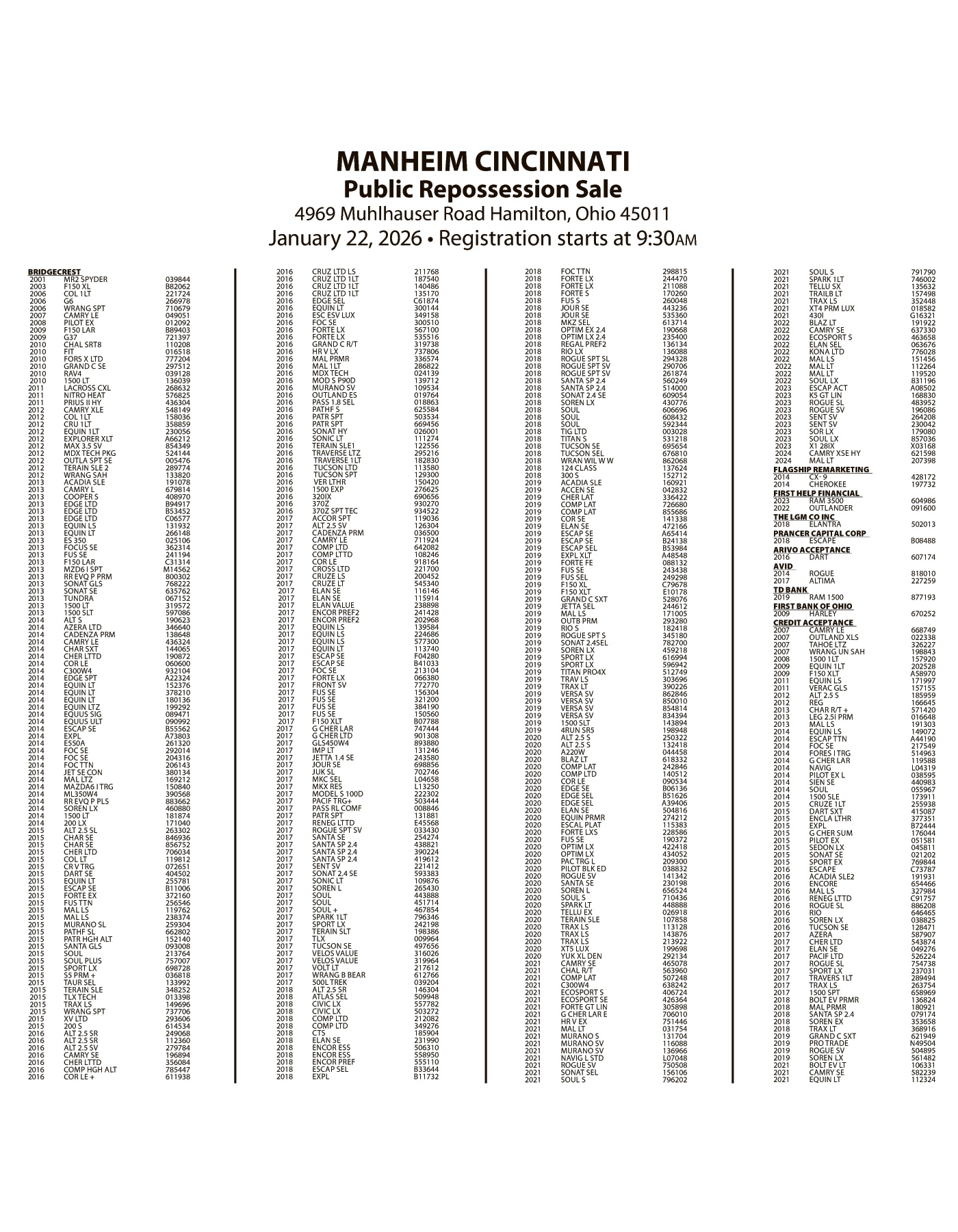 Legal Notice - MANHEIM JANUARY 22 SALE