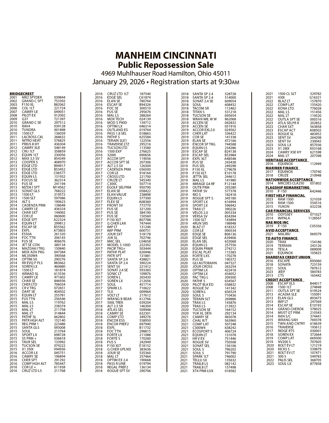 Legal Notice - MANHEIM JANUARY 29 SALE