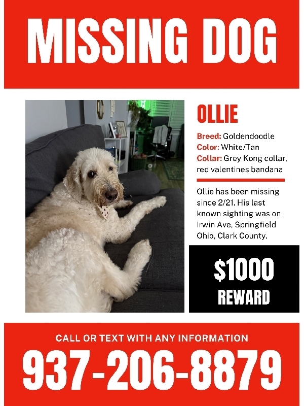 Ollie Goldendoodle LOST 1000 $1000 REWARD - LOST GOLDENDOODLE WHITE LAST SEEN 2/21 on IRWIN AVE SPRINGFIELD OHIO